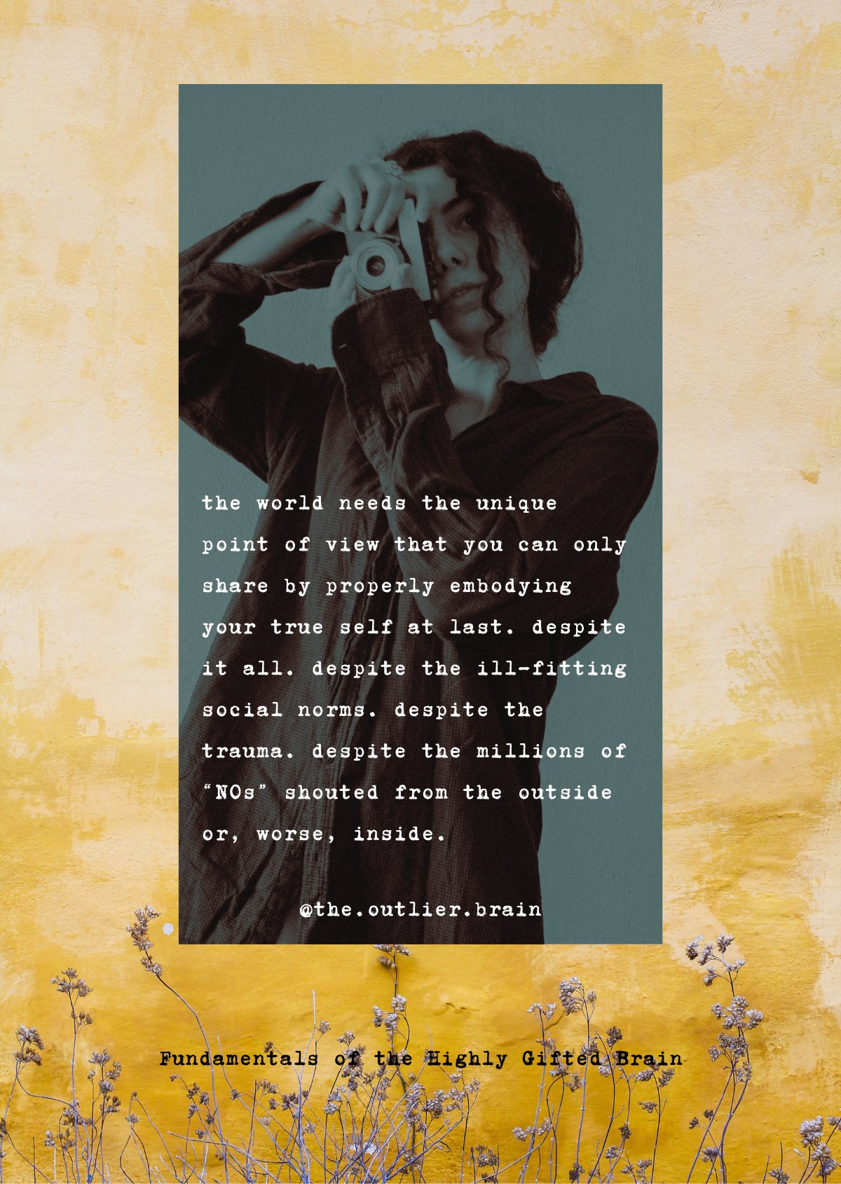 Similarly, our gifted brains have not been supported by typical parenting and societal structures, even for those of us fortunate enough to have accessed highly elite academic settings. These are, unfortunately, not places that understand the entirety of how we function and flourish.